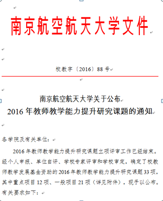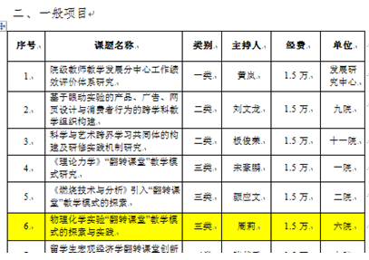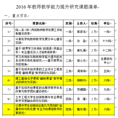 日前,根据学校发布的《关于公布2016年教师教学能力提升研究课题的通知》(校教字〔2016〕88号),确定了校教师教学发展基金资助的2016年教师教学能力提升研究课题33项,其中成人漫画 共3项,成人漫画 推荐申报的项目全部立项。胡晓丹老师的《理工基础化学课程“翻转课堂”教学模式的研究与实践》、魏东博老师的《以提升学生创新创业能力为导向的“金属材料与热处理”专业方向课程教学改革研究》确定为重点项目,周莉老师的《物理化学实验“翻转课堂”教学模式的探索与实践》确定为一般项目。