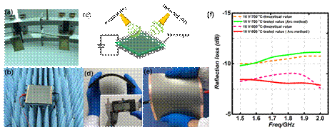 图1. (a-b)弓形法实测柔性器件低频雷达反射损耗的照片;(c)弓形法测试低频雷达反射损耗的原理示意图;(d-e) 柔性器件厚度的实测照片;(f) 弓形法和同轴线法所得1.5-2.0 GHz的雷达反射损耗