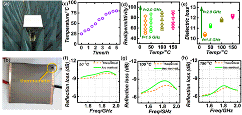 图2. (a-b) 弓形法变温测试实物照片;(c) 施加16 V偏压时的温度-时间曲线;(d) 25-150 °C柔性器件的介电实部;(e) 25-150 °C柔性器件的介电损耗;柔性器件在1.5-2.0 GHz,不同实用温度时的雷达反射损耗曲线:(f) 50 °C, (g) 100 °C, (h) 150 °C