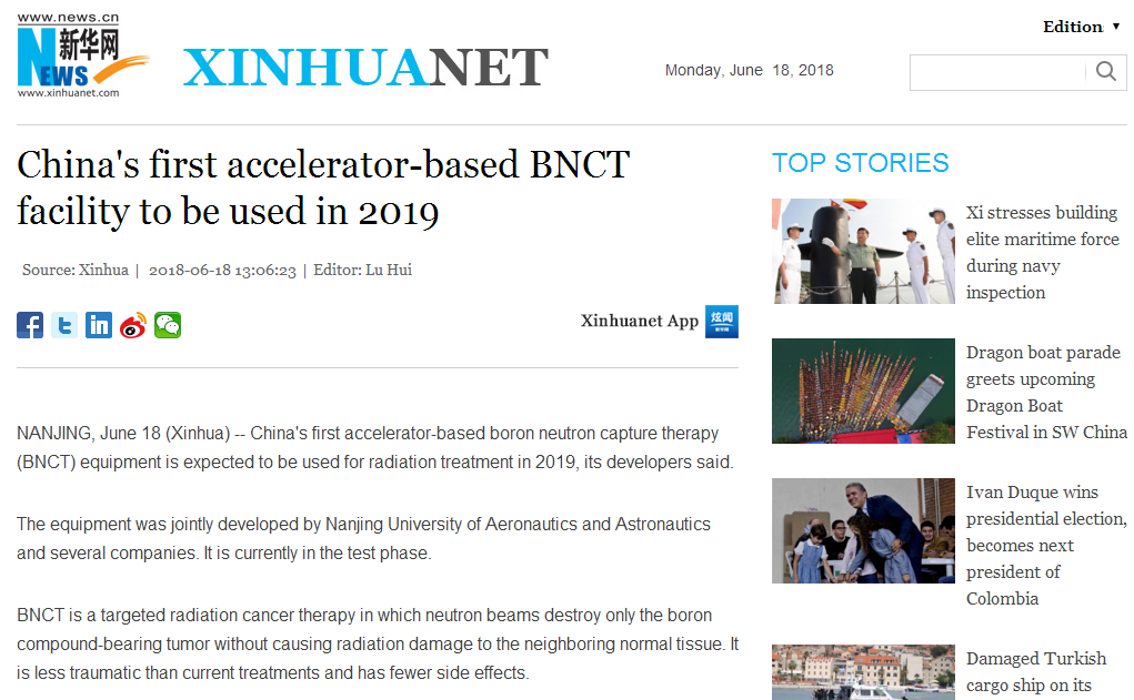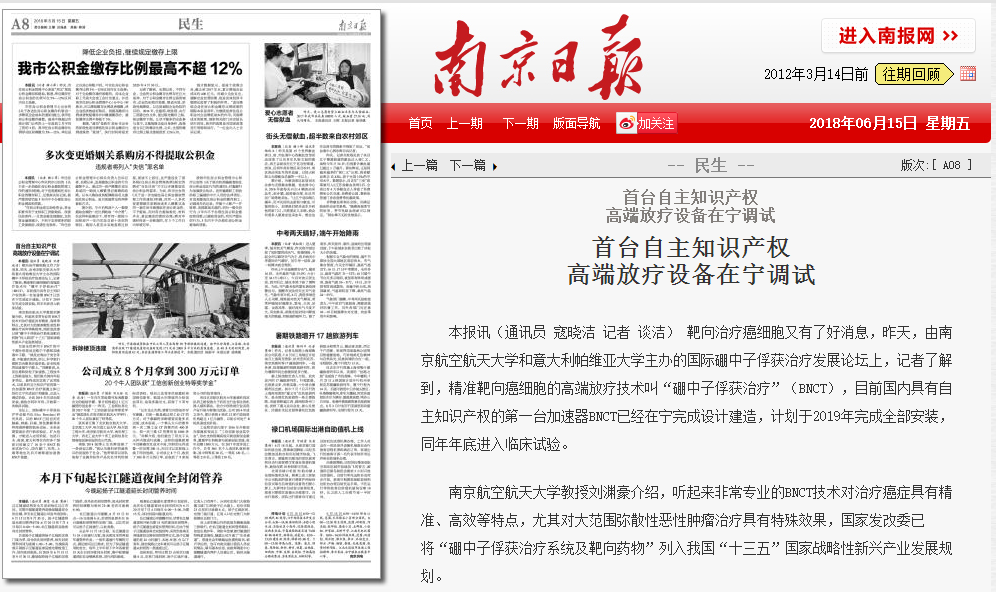 6月14日,由南京航空航天大学和意大利帕维亚大学联合主办的2018国际硼中子俘获治疗发展论坛在南京开幕。我校成人漫画 核科学与工程系汤晓斌教授与江苏省产业教授、南京中硼联康医疗有限公司首席科学家刘渊豪教授共同担任本次论坛主席。记者从会上了解到,目前,由南京航空航天大学、南京中硼联康医疗科技有限公司等单位联合开发的,具有自主知识产权的国内第一台加速器BNCT治疗装置主体已经完成设计和建造,进入调试阶段,并计划于2019年完成全部安装。