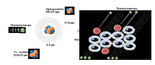 BNCT是一种结合中子辐照和靶向药物的二元放射治疗方式,其基本原理是利用热中子与非放射性的10B发生中子俘获反应10B(n, α)7Li释放出两个高传能线密度(LET)的粒子——分别是α粒子(约150 keVμm-1)和7Li粒子(175 keV μm-1)。这些粒子在组织中的射程与细胞直径相似,其射程约为5 μm -9 μm。同时,10B(n, α)7Li反应截面达到3837靶恩,远大于中子与人体正常组织和血液组成核素的反应截面,因此,在热中子照射情况下,α和7Li粒子的杀伤作用仅限于摄取10B药物的细胞及其紧邻细胞,中子对未摄取10B的正常组织的辐射损伤效应可以控制在安全的剂量水平。鉴于含硼药物对肿瘤细胞的靶向性,BNCT可以选择性地在细胞尺度内有效地杀死肿瘤细胞,提高肿瘤控制概率,同时尽可能避免正常组织的损伤,降低正常组织副作用发生概率。