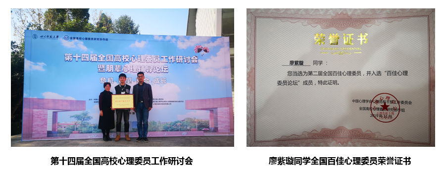 近日,第二届全国百佳心理委员论坛在四川师范大学举行,经面试和综合考虑,学校心理中心推荐成人漫画 廖紫璇同学与能源与动力学院、民航/飞行学院等的两位同学参加全国评优。最终,三位同学从190名参赛者中脱颖而出,成功进入前一百名,荣获“第二届全国百佳心理委员”荣誉称号。