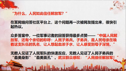 小组代表董美静和张道洋从人民军队在不同时期的突出人物、英雄事迹等方面,对人民军队另一大特色“为人民服务”进行了阐释。倒在一线的抗洪烈士、舍己为人的人民官兵,都在践行着“从群众中来,到群众中去”的路线。正如习近平总书记所言:“只要始终站在人民立场上,赢得最广大人民衷心拥护,就能构筑起众志成城的铜墙铁壁。”