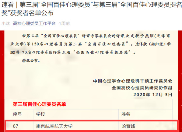 2020年是全国高校心理委员工作研讨会暨朋辈心理辅导论坛举办的第十五年。11月23日上午,第十五届全国高校心理委员工作研讨会暨朋辈心理辅导论坛以线上直播的形式正式拉开帷幕。经过全校综合选拔,示推荐了成人漫画 的哈晋峰、电子信息工程学院的罗岚、民航/飞行学院的张晨阳、同学参与全国百佳心理委员的评选。最终,哈晋峰从全国248名参赛者中脱颖而出,荣获“第三届全国百佳心理委员”称号,罗岚,张晨阳同学荣获“第三届全国百佳心理委员提名奖”。
