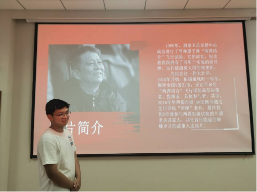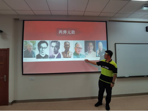 团课的开始,陶广揆同学向大家简单介绍了我国“两弹”发展史,指出“中国的‘两弹一星’是20世纪下半叶中华民族创建的辉煌伟业”,并向同学们推荐了纪录片《两弹结合风云录》,共忆昔日隐秘而峥嵘岁月的故事。