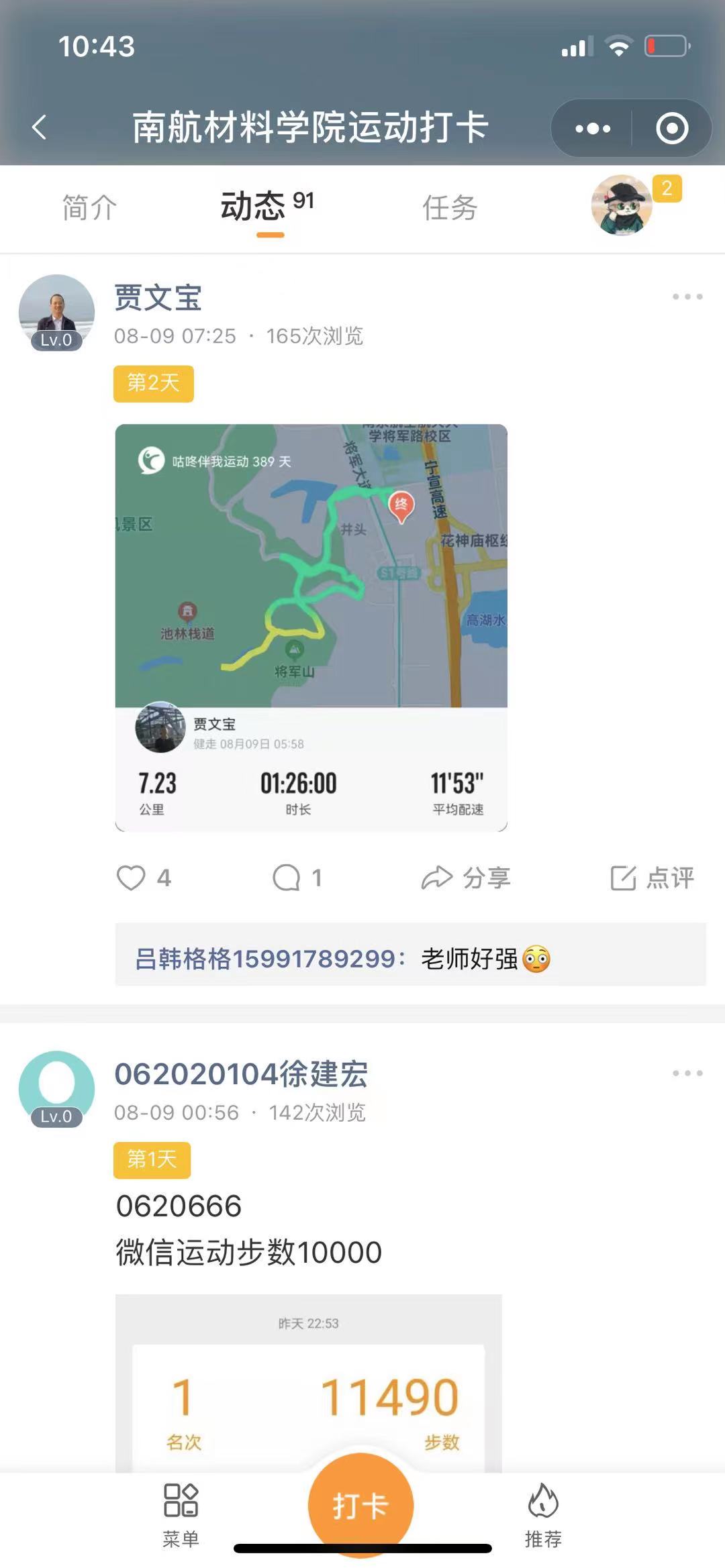 8月8日,我国奥运健儿以88枚奖牌总数的成绩结束了东京奥运会的征程,8月8日也是第十三个“全民健身日”,当天成人漫画 面向全体师生开辟“南航成人漫画 运动打卡”圈,步数达到一万步、锻炼达到30分钟就可以进行打卡,活动当天圈内成员就达110人,参与打卡58人次,材院师生纷纷发布运动状态,有操场跑步的、有紫金山跑步的、有跟着keep软件锻炼的、有跳绳的、打篮球的、打羽毛球的……不管是在校还是居家,疫情期间都在积极参加体育锻炼。该活动长期有效,每月根据打卡次数进行排名,对前十名师生给予奖励,根据跑步图案也会评选最具创意奖、最有毅力奖、最长距离奖以及最快速度奖等!