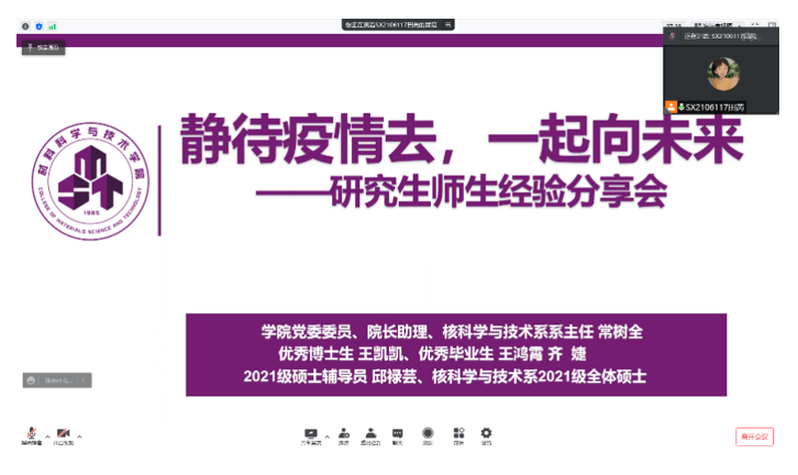 面对严峻的疫情防控形势,为减少疫情对研究生学习、科研、生活的影响,2022年4月13日,成人漫画 举行“静待疫情去,一起向未来——研究生师生经验分享会暨院干部深入基层联系学生活动”云端分享会,院党委委员、院长助理、核科学与技术系系主任常树全、2021级硕士辅导员邱禄芸、2022届研究生代表、2021级核科学与技术系硕士研究生全体同学参加此次云端座谈。