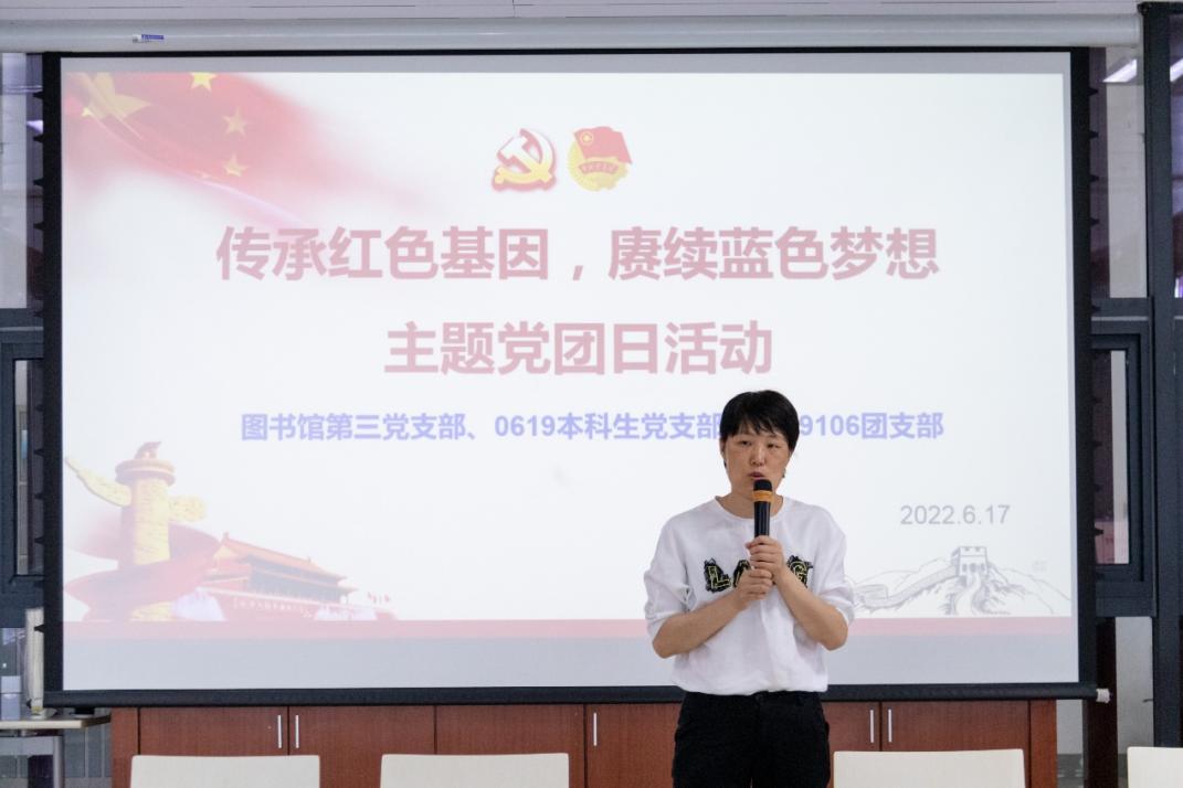 首先,图书馆第三党支部书记赵立芹、成人漫画 0619党支部书记张进鹏、0619106团支部书记陈龙分别介绍了各支部成员和建设情况。随后,院团委书记徐萍领学了习近平总书记在庆祝中国共产主义青年团成立100周年大会上的重要讲话精神,从“一探大会召开日,二探架构理脉络,三探金句寄期望,四探学后说感想”四个方面带领支部成员深入学习讲话精神;0619106团支部书记陈龙分享了学习感悟,分享了0619106团支部在“传承红色基因,赓续蓝色梦想”道路上的努力、发展与成效,表达了通过此次学习,收获了振奋的心情、坚定的信念以及强烈的自信。