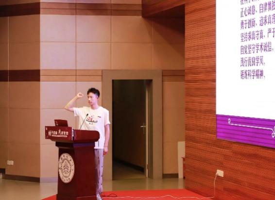 硕士新生代表张大龙带领新生们进行学术诚信宣誓,全体新生签署了《学术诚信承诺书》,做自觉维护学术诚信、坚守学术道德的践行者和维护者。