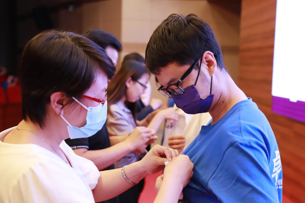 各系老师为2022级研究生新生代表佩戴南航校徽,台下全体新生共同佩戴校徽。从戴上校徽的那一刻起,就真正成为南航研究生。