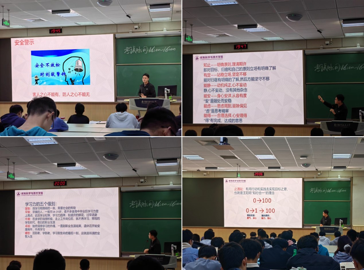 本科生辅导员倪永谦从近期部分同学出现学习上的焦虑、生活中的迷茫入手,剖析同学们不安定的原因,引出本次月讲评的主题“知止而定”。倪永谦指出,“止”有三层含义,一是禁止,他结合本科生学生手册相关内容重点强调了“禁止”的几个方面,主要包括考试违纪、在宿舍使用违规用电器、夜不归宿等,筑牢学生的底线意识;二是明确目标,在学习生活中明晰自己的目标和定位;三是知行合一,既需要0到1的决心与勇气,也需要1到100的恒心与毅力。倪永谦勉励同学们要敢于挑战自我,勇毅前行。