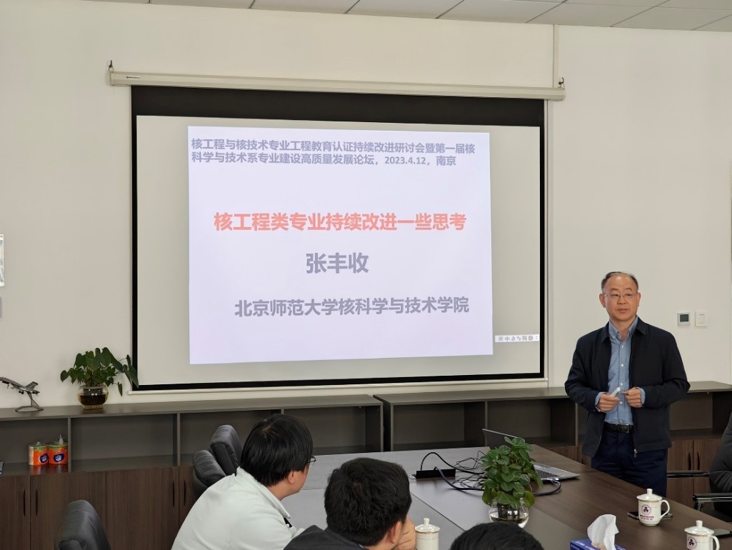 为了推动工程教育认证持续改进工作高质量内涵式发展,促进核工程与核技术专业人才培养质量不断提升,4月12日上午,成人漫画 组织召开核工程与核技术专业工程教育认证持续改进研讨会,邀请教育部高等学校教指委核工程类专业教学指导委员会副秘书长、北京师范大学核科学与技术学院张丰收教授出席会议并作主题报告,会议由副院长陶海军主持,材料加工系副主任李斌斌、核科学与技术系副主任龚频、主任助理何庆华及部分教师代表参加会议。