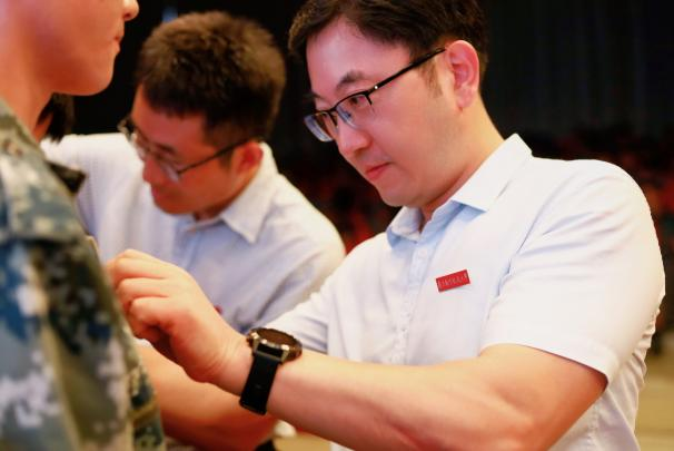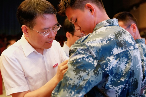 与会老师为新生代表佩戴南航校徽,台下全体新生共同佩戴校徽,宣告自己成为了一名真正的南航人。