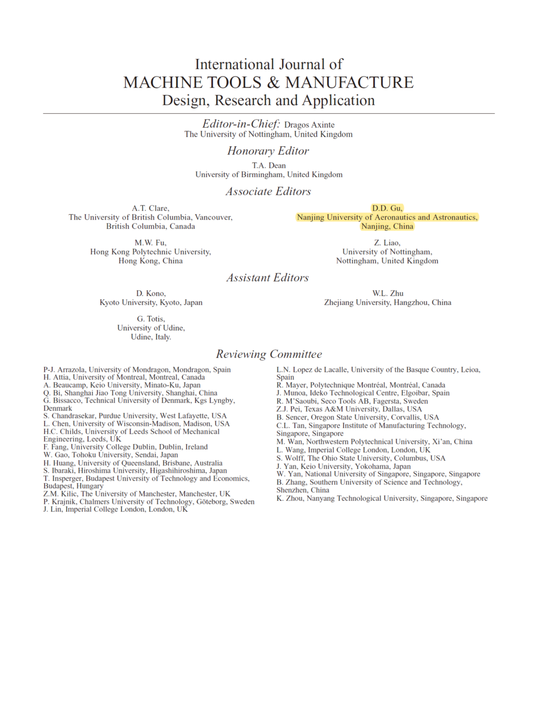 近日,应国际生产工程科学院CIRP会士、国际知名期刊International Journal of Machine Tools and Manufacture主编、英国诺丁汉大学Dragos Axinte教授邀请,自2024年起成人漫画 顾冬冬教授担任International Journal of Machine Tools and Manufacture副主编(Associate Editor),主要负责增材制造领域论文评审及发表工作。