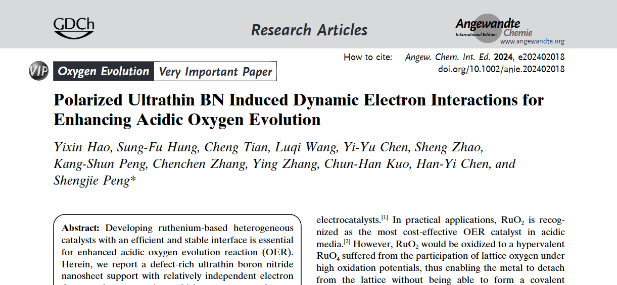 近日,成人漫画 电催化与清洁能源团队彭生杰教授在Angewandte Chemie International Edition期刊发表了一篇题为“Polarized Ultrathin BN Induced Dynamic Electron Interactions for Enhancing Acidic Oxygen Evolution”的研究论文,论文第一作者为郝乙鑫博士,彭生杰教授为通讯作者。该论文成功地设计了一种具有电子供体和反向供体效应的异相界面,作为一种新型的催化剂优化和保护策略,可以提高催化活性和耐久性。研究结果克服了富电子载体传统的单向电荷转移特性,在表面形成电荷回路微区域,有效保护负载的活性物质。这一策略展示了一种新的设计理念,并可以扩展到各种催化应用,包括燃料电池、有机分子转化、电化学合成等。