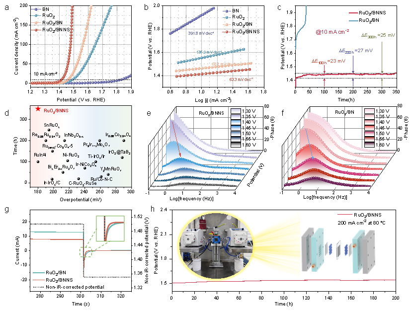 优化的RuO2/BNNS催化剂的过电位仅为180 mV,在酸性OER条件下可连续运行350小时,表现出卓越的稳定性,优于商用RuO2和大多数Ru基催化剂。为了阐明催化界面上的电荷转移过程,在各种施加偏置下进行了Operando EIS测试,以跟踪动态演化。Bode图显示更多的电子参与OER催化,而不是表现出电容器行为。此外,脉冲伏安法对电催化剂上积累的正电荷进行量化,RuO2/BNNS的较高峰值阴极瞬态电流表示更快的电荷积累和耗散速率,表明BNNS的电荷定向转移特性有利于Ru位点的催化周转。