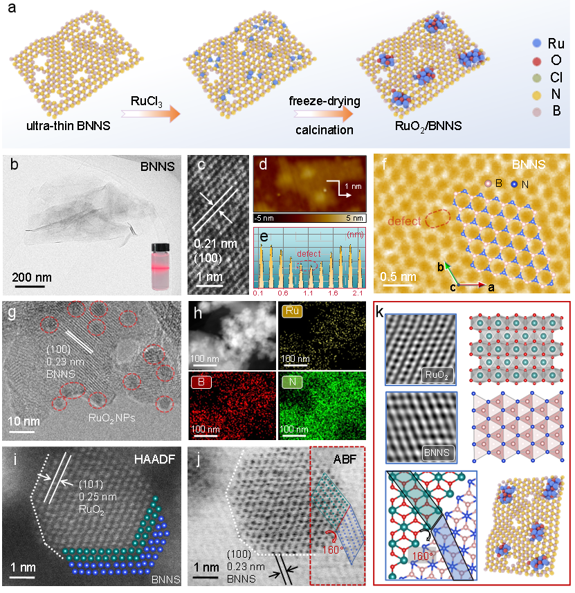 研究团队通过熔融盐水热与淬火剥离策略剥离超薄氮化硼纳米片。每个超薄的BN纳米片都可作为有效的载体,利用暴露的晶格缺陷作为合成过程中吸附Ru前驱体的途径。通过扫描电子显微镜、透射选择显微镜和原子力显微镜可以看出,BNNS具有较大的横向尺寸和重叠特征的超薄层状结构。进一步加载后,RuO2晶面沿BNNS面生长,并由于相似的晶格参数而延伸到仅由BN组成的区域。插入的原子排列图像在异质界面处表现出极好的晶格匹配,表明RuO2NPs外延生长自BNNS基质。晶格匹配极大地改变了界面键合,并形成大量Ru-N键。这种原子连接的共晶体提供了从电子丰富的N端边缘到Ru金属的高效电子转移,从而在OER过程中实现快速反应动力学。