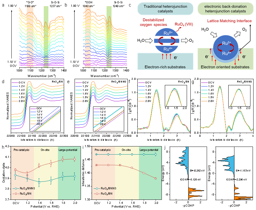 研究团队采用ATR-SEIRAS光谱法鉴定反应中间体,发现RuO2/BN的OER过程在高过电位下主要受LOM控制,因此加速催化剂溶解并降低稳定性。相比之下,RuO2/BNNS的光谱揭示了动态氧耦合吸收带的消失,表明晶格氧原子的稳定性。原位XAS显示即使在高氧化电位下,RuO2/BNNS可以保持稳定的结构,而RuO2/BN经历了显著的动态溶解过程,这归因于晶格氧机制的参与。
