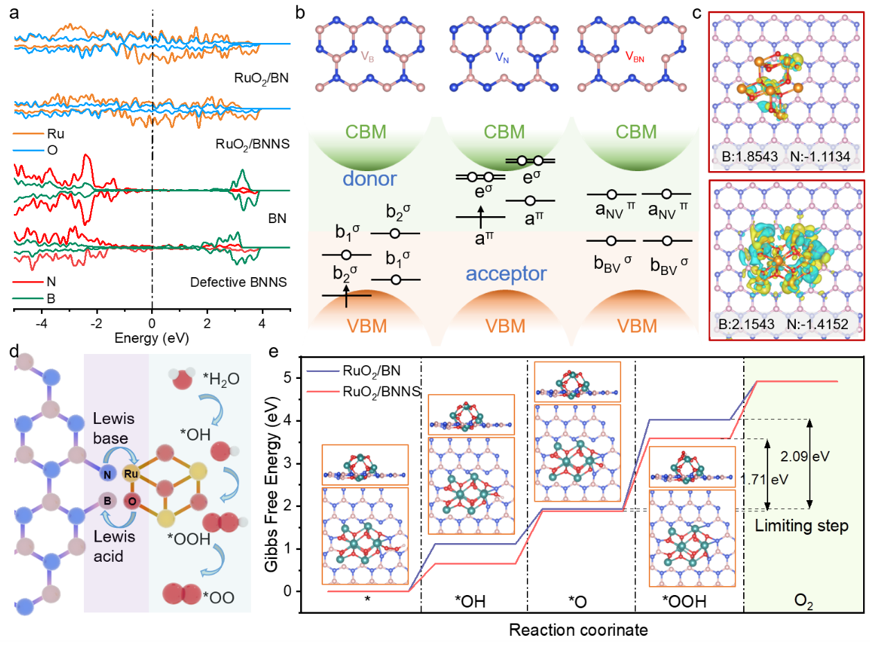 研究团队进一步挖掘发现,在运行过程中N端边缘作为具有较高电子密度的路易斯碱位点,有助于保持Ru的稳定氧化态。同时,连接到O位点的B端边缘接受并稳定反应电荷,从而在高反应电位下抑制晶格氧。Ru氧化态的增加可以看作是氧逸出。从这个角度,进一步分析了BNNS稳定活性物种的电子反向供体效应。对于RuO2/BN,钌离子的氧化过程相对较快。随着极化电流的不断增加,表面电荷无法及时补充,导致电子从表面氧中去除。这导致氧气逸出以及结构重建。相比之下,对于BNNS,B端和N端分别充当电荷受体和电荷供体,完成局部电荷循环。同时,由于极化键的存在,B位点容易受到亲核攻击,使得中间体M−OH和M−OOH在Ru位点上的去质子化反应相对容易。