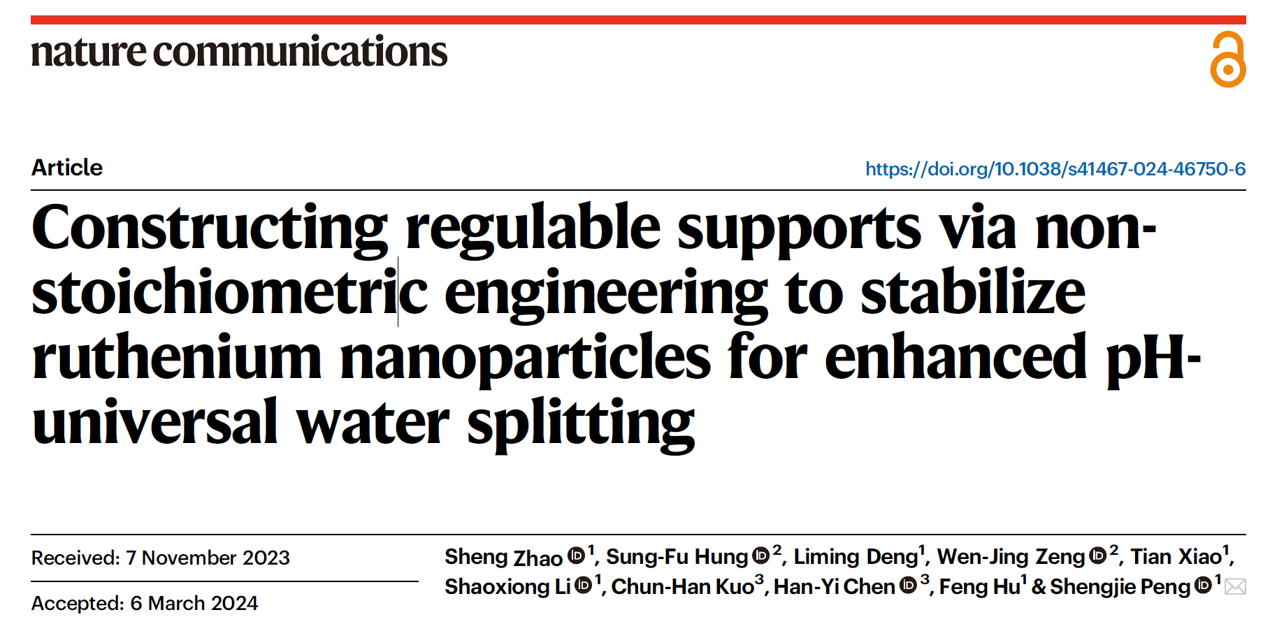 近日,成人漫画 电催化与清洁能源团队彭生杰教授Nature Communications期刊发表了一篇题为“Constructing regulable supports via non-stoichiometric engineering to stabilize ruthenium nanoparticles for enhanced pH-universal water splitting”的研究论文,论文第一作者为成人漫画 博士生赵晟,彭生杰教授为通讯作者。
