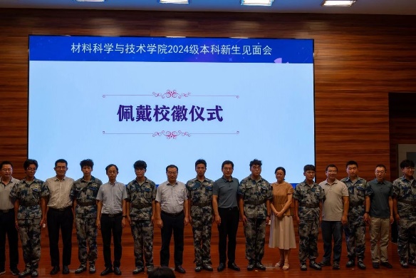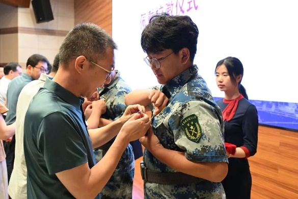与会领导和老师为2024级新生代表佩戴南航校徽,台下全体新生共同佩戴校徽宣告自己成为一名真正的南航人。
