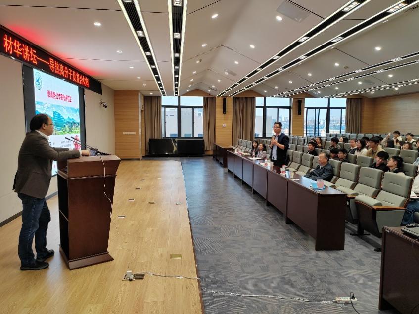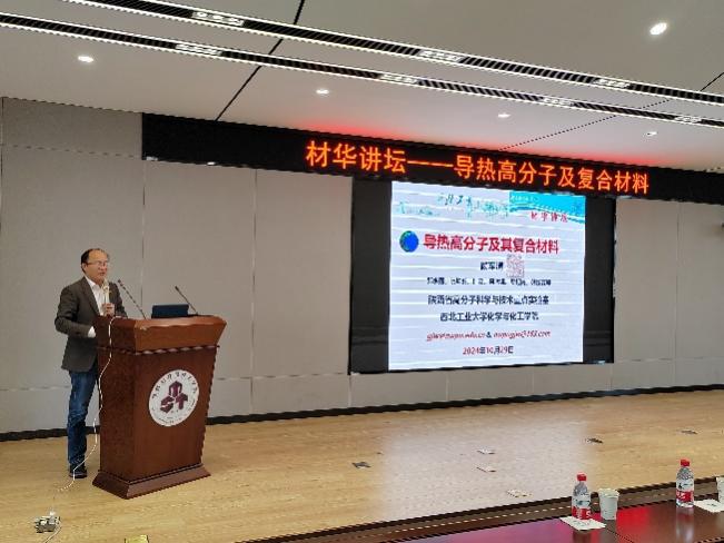 顾军渭教授围绕课题团队的最新研究成果,全面而深入地介绍了导热高分子及复合材料的研究进展和最新成果,并详细阐述了导热材料的基本特性、制备方法、应用领域以及当前面临的挑战,同时展示了导热高分子及复合材料在科技和工业领域的广阔前景。顾军渭教授的报告内容丰富、精彩纷呈、见解深刻,报告历时两个小时,赢得了在场师生的阵阵掌声。报告提问互动环节,顾教授结合自身育人经历,就新青年老师如何进行高质量教学、科研及育人等问题进行了经验分享,在场师生围绕材料的力学、吸波和导热的兼容性与顾教授进行了充分的交流与讨论。