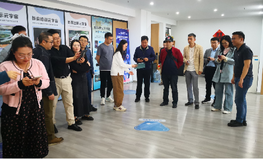 随后,张帅介绍了南京增强现实元宇宙科普教育中心,展示了增强现实元宇宙在教育培训、图书出版、展览展示及文创商品领域的应用。还带领大家参观了元宇宙展览中心,沉浸式学习了最新的AR技术和应用场景,各位老师获得了将虚拟数字信息叠加到真实环境中从而达到虚实相合的超现实感官体验。