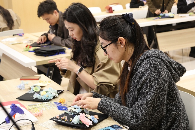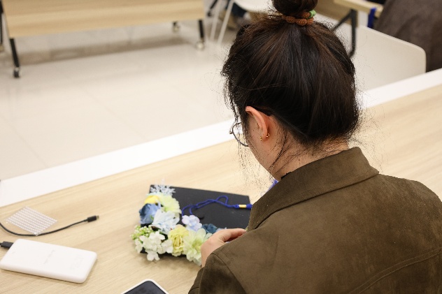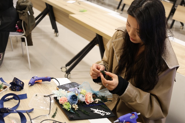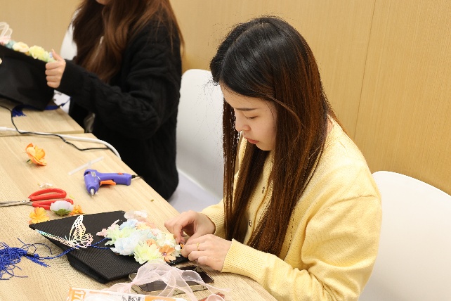 随后,学位帽簪花手工体验正式开启。同学们以学位帽为创作基底,用鲜花、枝叶等材料自由搭配、精心粘贴,在专注创作中沉淀思绪、舒缓压力。指尖的创意转化,让毕业季的紧张与不安慢慢消散,每一顶簪花学位帽,都是独属于青春的美好纪念。