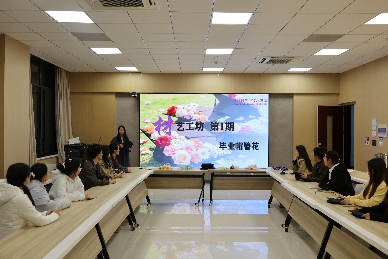 “材艺工坊”第一期学位帽簪花团体辅导活动于3月26日晚在东区材料楼B322a顺利举办,研究生辅导员与部分毕业研究生参与本次活动。